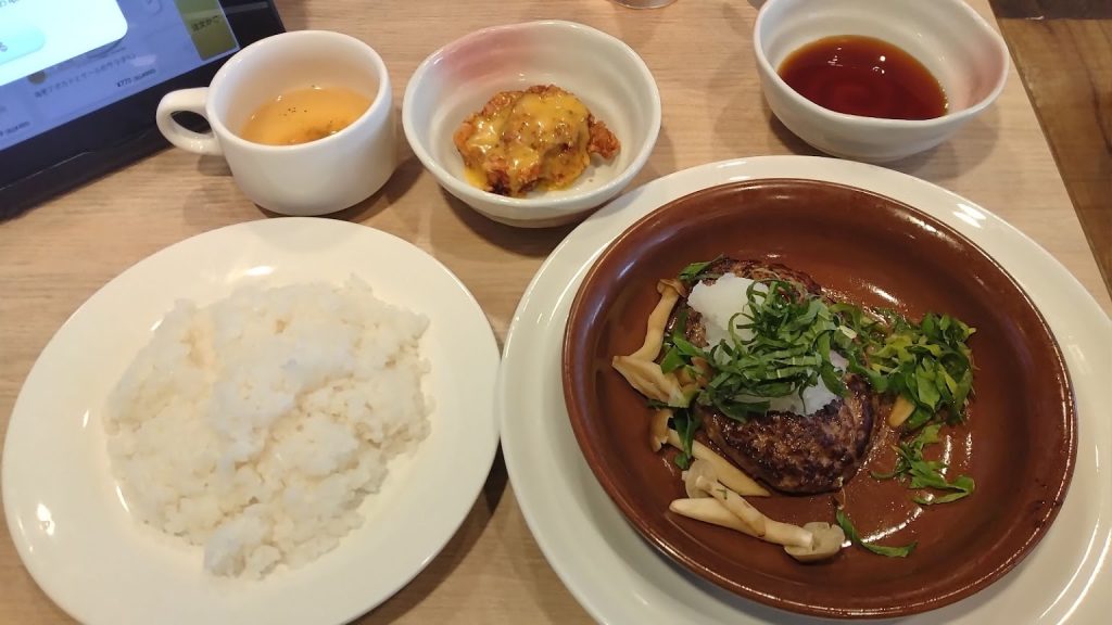 九条ねぎと大葉おろしの粗挽きステーキハンバーグ 990 円,ハニーマスタードもも 1 個 170 円,ライスドリンクバーセット 370 円を選択。